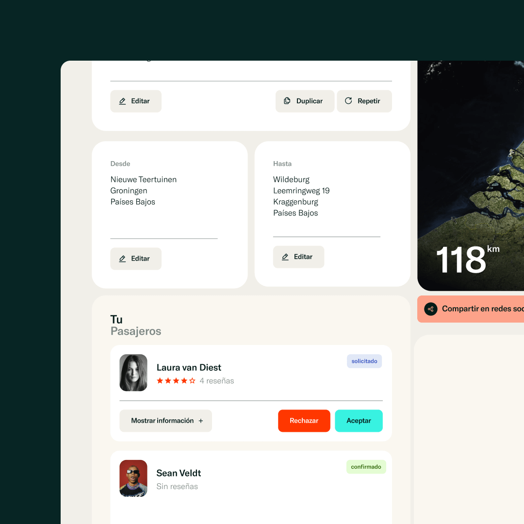 Quieres que tus asistentes tengan control total sobre sus propios trayectos, para que no tengas que gestionarlos por ellos. Al ofrecer o reservar un viaje, pueden actualizar fácilmente sus datos a través de su cuenta de usuario.
