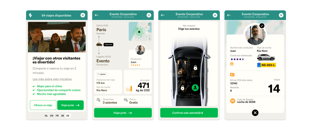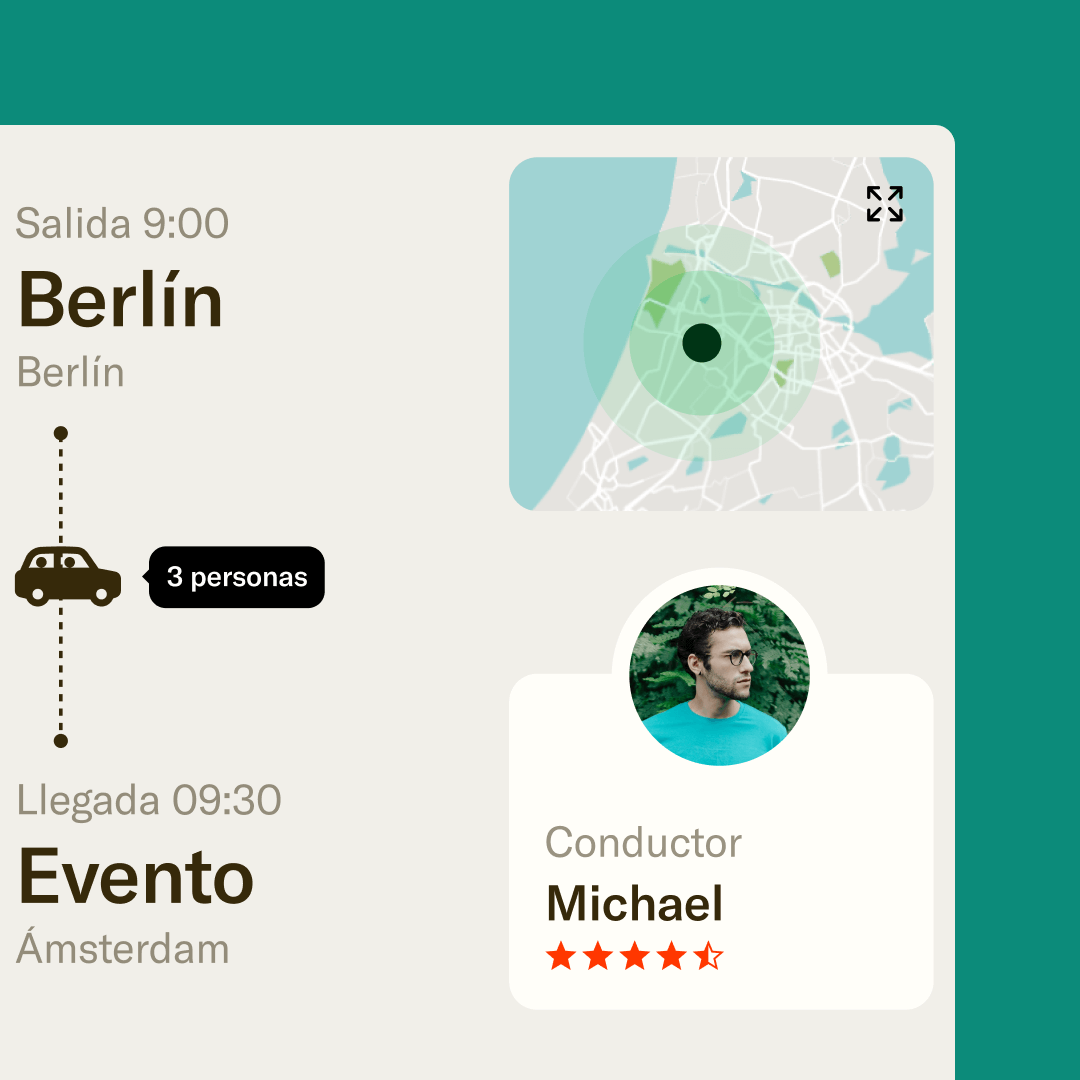 Nuestro sistema encuentra automáticamente las mejores paradas para que los conductores recojan pasajeros en el camino. Si no hay trayectos disponibles, los asistentes pueden unirse a la lista de espera y recibir una notificación tan pronto como se abra uno. Cuantos más trayectos se compartan, mayor será el impacto.