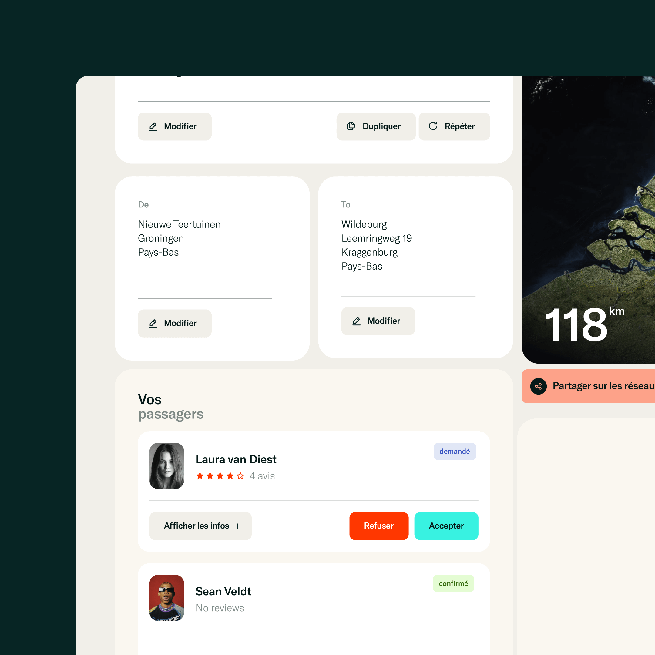 Vous souhaitez que vos participants aient un contrôle total sur leurs trajets, afin de ne pas avoir à les gérer vous-même. Lorsqu’ils proposent ou réservent un trajet, ils peuvent facilement mettre à jour leurs informations via leur compte utilisateur.