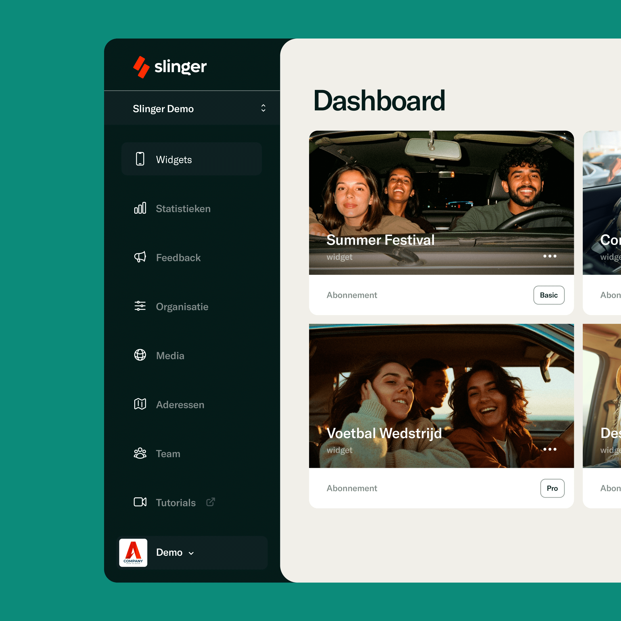 Alles om samen rijden te activeren: zichtbaarheid in de Slinger app, een web app voor je eigen kanalen, een deelbare landingspagina en een dashboard met inzicht in ritten, CO₂ besparing en ledentevredenheid.